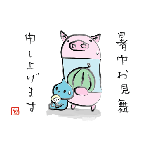 暑中お見舞の葉書をイメージして描きました。 ちゃいリアンも暑いんです、多分。 |