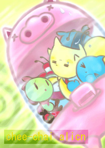 いつも都合よく、1人ずつ遊びに来るのではなく、たまには『こんな日』が、あってもいいかな〜と思い、描いてみましたv(笑) 私の中の『ちゃいりアン』は、可愛くてホノボノした、でも辛口な事を言うくせに、ちょっと(?)間抜けなイメージなので、そのイメージそののままの絵です(苦笑) |