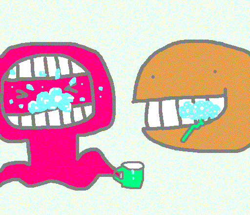 アングリは 歯みがきが 終わるまで 目を とじています。 カミカミは 歯ブラシを かんで みがきます。 だから いちど みがけば 歯ブラシは ぼろぼろ。 |