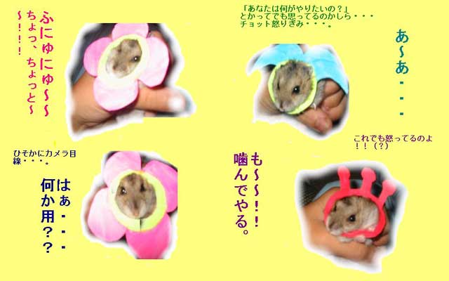 今回2回目の応募です。前は絵だったけど、今回は我が家のハムスターで・・・。 自分で立っているところを撮りたかったんだけど、すっごい嫌がって、無理でした。結局つかんでしました(汗) |