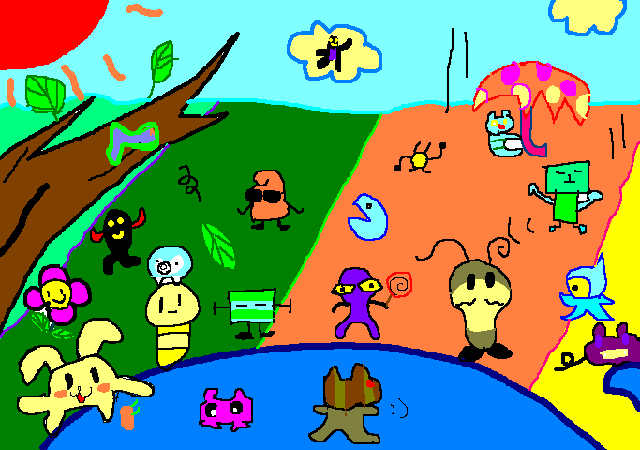 明るい太陽がみんなを照らしていて、ちゃイリアン達が楽しく遊んでいます。そして、私たちに「いっしょに遊ぼうよ!」と声をかけています! | |