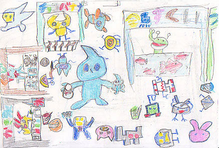 チャイリアンたちがお祭りでお店をひらいたり金魚すくい、くじ、かき氷、チョコバナナなど食べたり、参加しているところを書きました。 この絵はお祭りの一部です。 |