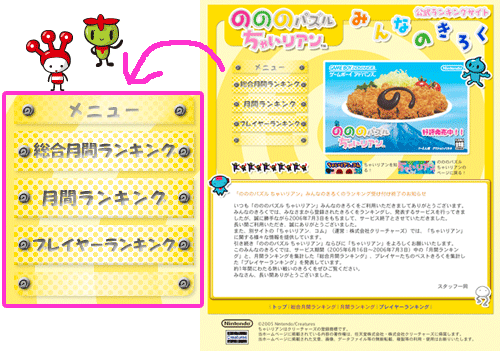 2005年6月16日~2006年7月3日までの、月間ランキングを集計した「総合月間ランキング」と、プレイヤーの最高きろくを集計した「プレイヤーランキング」が追加されました。